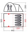 Палатка для кемпинга с большим тамбуром и одним спальным отделением. Конструкция позволяет установку тента отдельно и установку палатки во время дождя. Противомоскитные сетки на внутренней палатке и тамбуре. Объемный тамбур с тремя входами и ветрозащитной юбкой может использоватьсякак беседка с эффективной защитой от насекомых. Потолочная система вентиляции позволяет выводить конденсат.