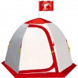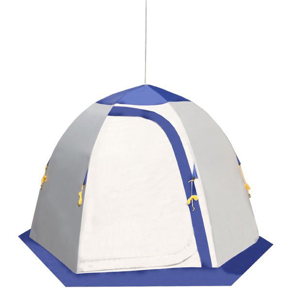 Тент палатки сделан из материала Oxford 210T 3000PU, усилен в нужных местах, швы обработаны клеем. Материал отлично пропускает свет, отталкивает воду, не боится механических воздействий. Комплектуется штормовыми растяжками, отражающими свет. Юбка замкнутая, что гарантирует плотное соединение с поверхностью и не дает ветру попадать внутрь. Вход в палатку большой, на молнии. Два замка помогают быстро расстегнуть или застегнуть молнию, а так же регулируют поступление воздуха при нагреве палатки. Защитные клапаны с липучками по контуру молнии спасут ее от попадания мокрого снега и обмерзания. Вентиляционный клапан сконструирован так, что позволяет находясь в палатке регулировать отток воздуха, а можно и совсем закрыть клапан. Имеется шесть карманов по двум стенкам палатки, в которых разместятся снасти. Эту палатку можно отапливать, соблюдая конечно меры безопасности. В комплект входит сумка, закрывающаяся молнией.