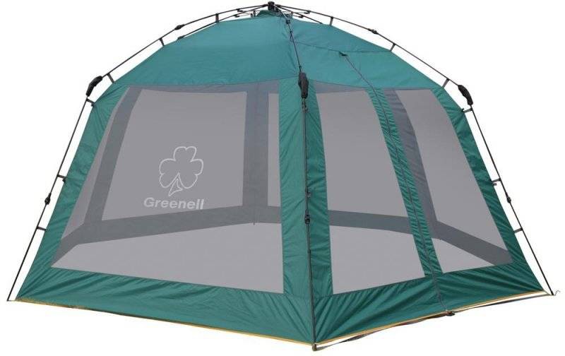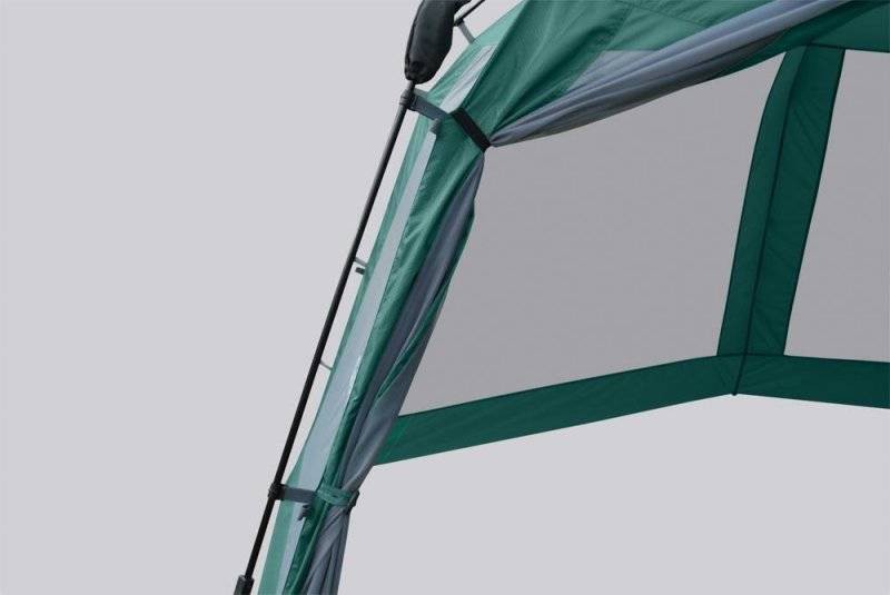 Огромный тент-беседка с полуавтоматическим каркасом. Легко ставиться одним человеком за 1 минуту. Облегченная регулировка оттяжек со световозвращающей нитью. Москитная сетка по всем сторонам.
