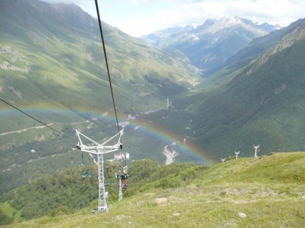 Первая высота! Знакомство с Приэльбрусьем начинаем с хорошо известной любителям горных лыж горы Чегет. 3650 метров над уровнем моря. Летом здесь тоже есть на что посмотреть. Даже Эльбрус подмигнул нам из-за тучек ;)) И это наша первая высота!
